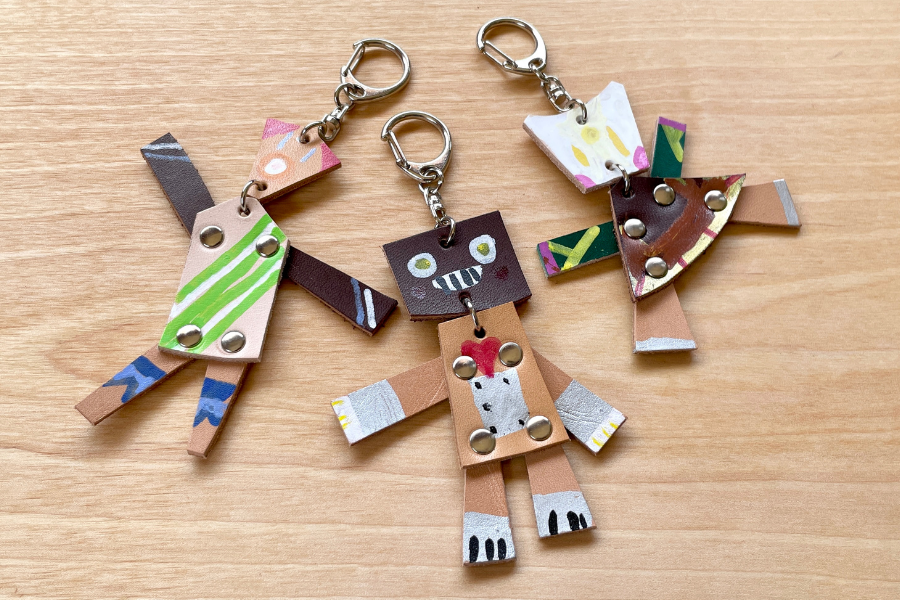 いろんな形の革に色をつけて、自分だけのキーホルダーを作ります。